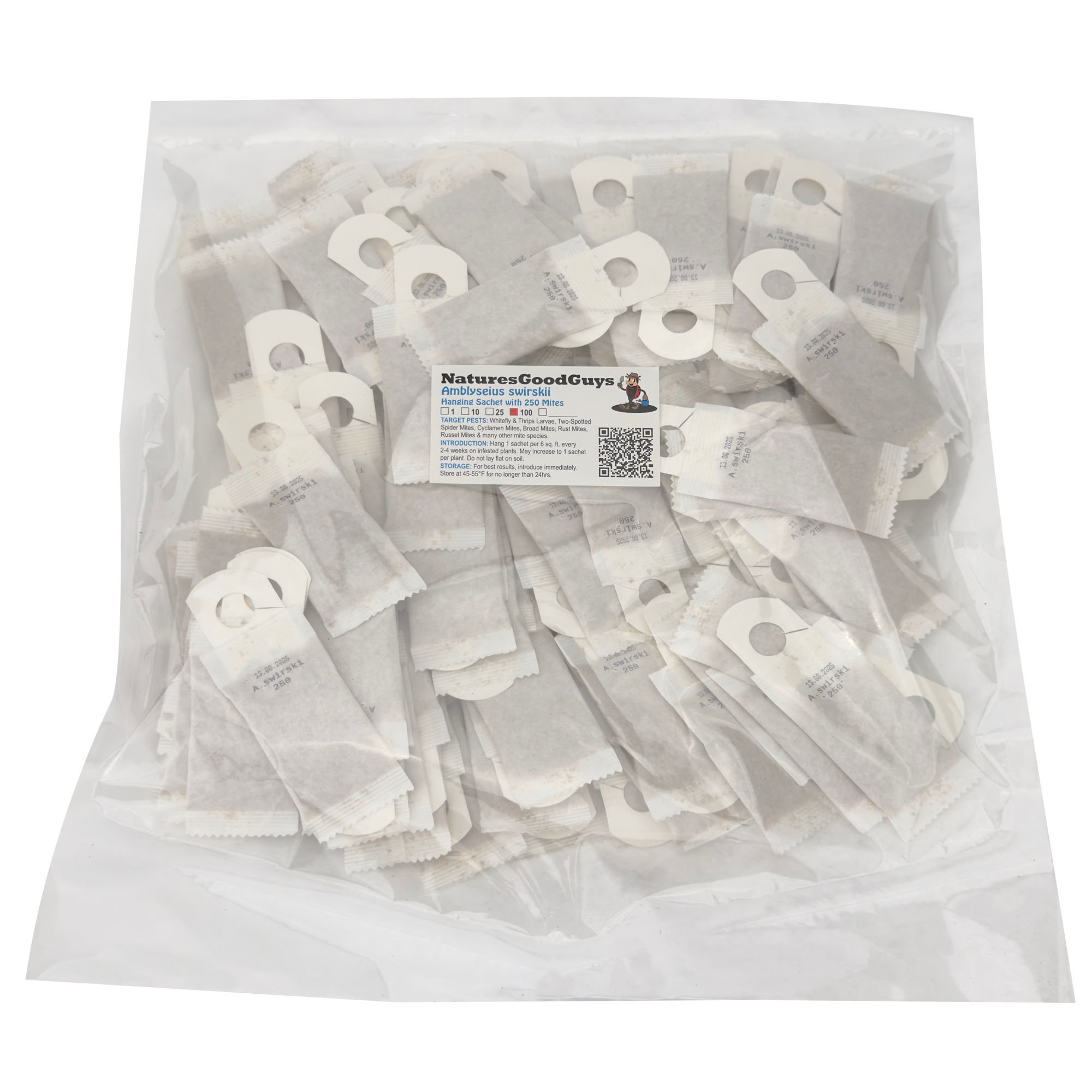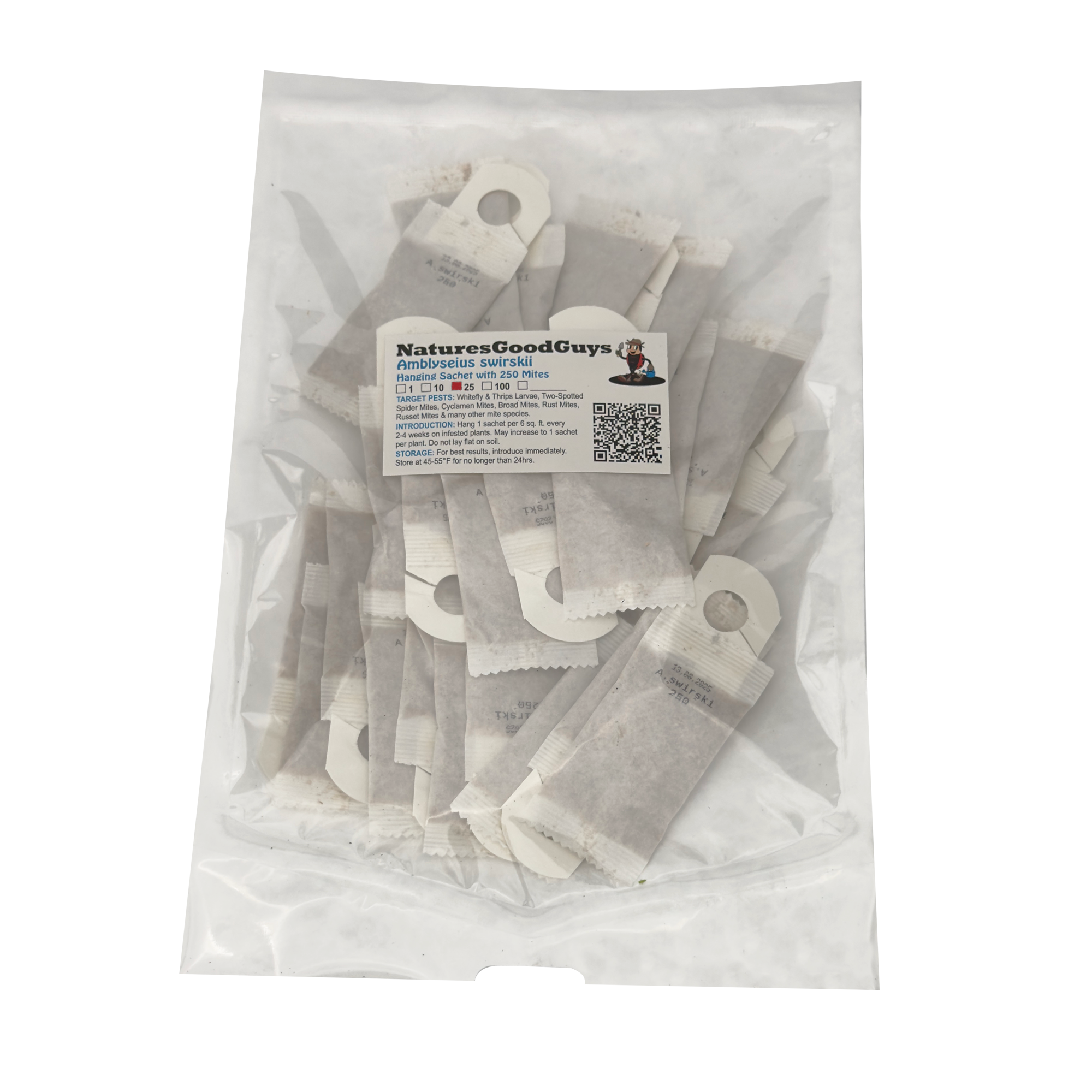 Each sachet contains a mix of eggs, immature, and adult predatory mites plus a food source.